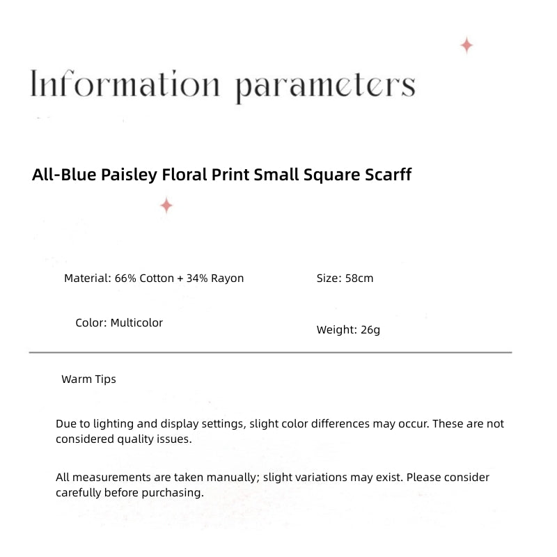 Elevate your fall wardrobe with this All-Blue Paisley Floral Print Small Square Scarf, made from a premium 66% cotton and 34% rayon blend for soft, breathable comfort. This lightweight scarf is versatile, serving as a neck scarf, headband, or decorative accessory, perfect for casual outings, office wear, or photoshoots.