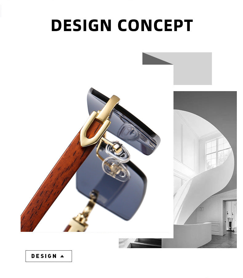 Men’s Rimless Square Sunglasses – Fashion Diamond-Cut Ocean Lens Shades with Wood Grain Arms, Retro Trendy UV Protection Eyewear